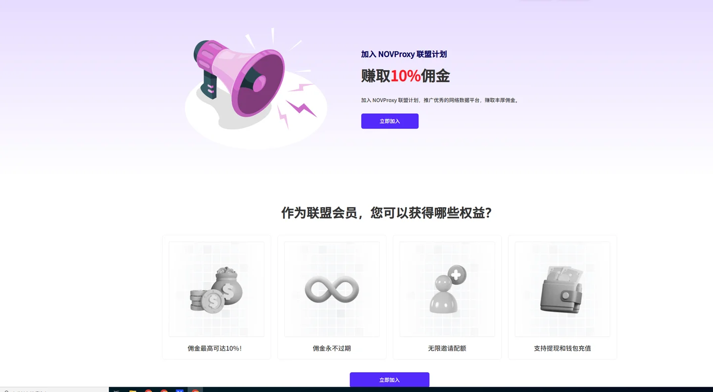 在联盟计划里您可以尝试获取您的晋升佣金了。访问 NovProxy 的官方网站,获取您的推广链接。您可以在任何通过您的链接完成支付的用户的个人页面上查看所有您的邀请数据。您还可以提取您的佣金,并通过任何支持的提供商进行转账。对于所有已支付的活动,您都能获得 10% 的佣金。这是一个固定的比率,不会改变。