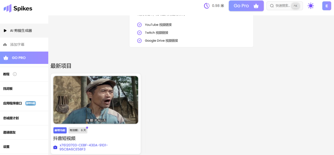 Spikes提供了一个简单而有效的免费使用方案:每个账户只需完成一个小任务(上传一段1分钟以内的视频进行剪辑),即可获得10分钟的免费使用额度。更棒的是,你可以通过生成邀请链接,邀请新用户注册,额外获得20分钟的免费使用时间。虽然免费版本会有水印,但对于初步尝试和非商业用途来说,已经足够用了。