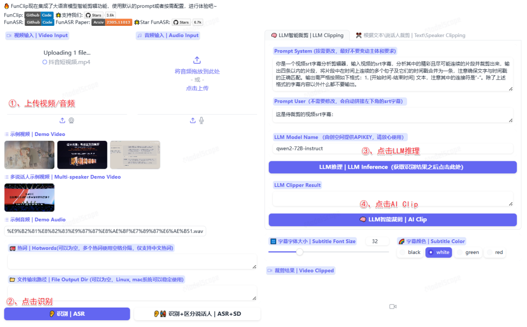 https://modelscope.cn/studios/iic/funasr_app_clipvideo/summary/