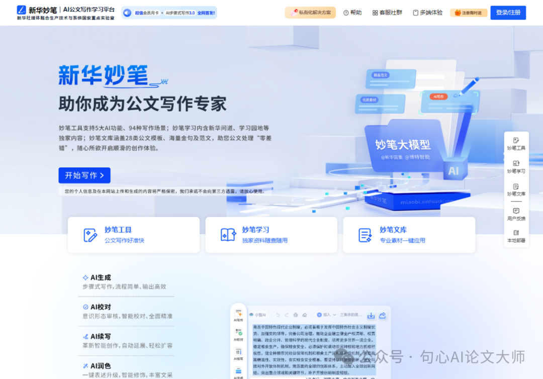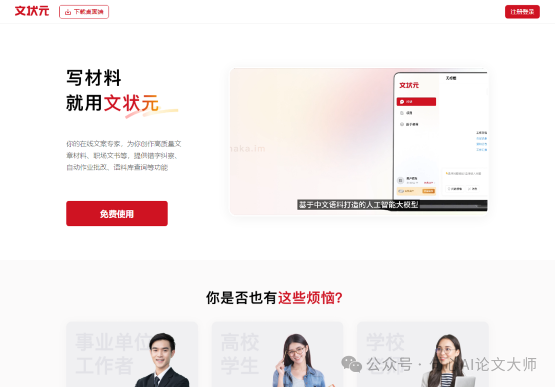 文状元AI写作是一款特别为需要大量写作的工作者设计的智能工具,目的是提高写作效率和内容质量。它基于最新的大语言模型,通过深度学习和大量中文语料的训练,可以理解并生成各种风格的文稿,适用于公文、学术论文、职场文书等多种场景。