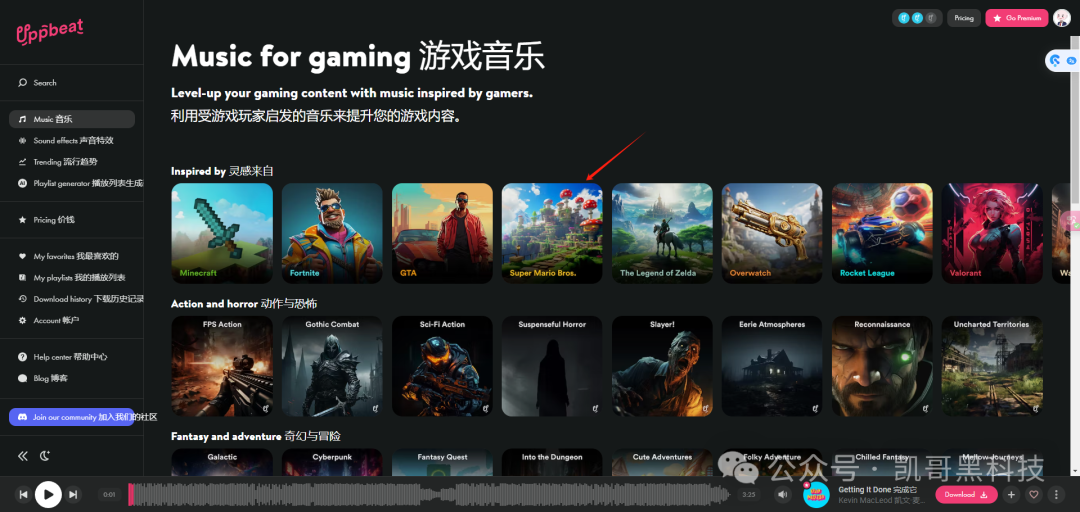 Uppbeat 是一个免费的音乐和音效素材库,适合内容创作者使用。提供的音乐都是无版权的,可以直接下载使用。例如,选择电影分类下载一段和马里奥游戏相关的音乐素材,然后把制作好的短视频和背景音乐进行合并。