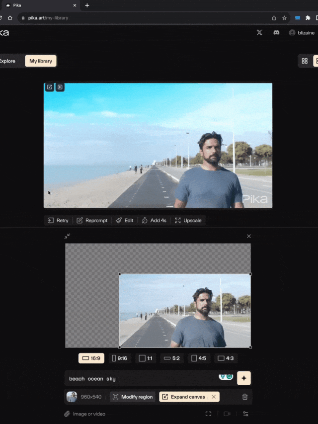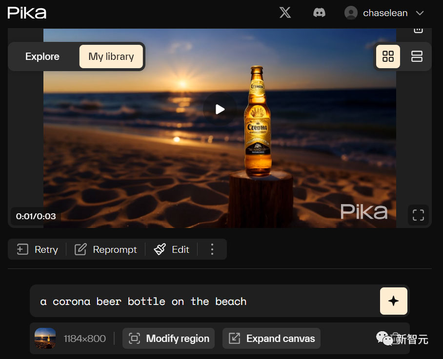 无论是戴上帽子,害臊羽绒服变装,服饰转换时的特效感。还可以把周边的物体变成松柏,甚至把自己变成北极熊!还有人恶搞泰坦尼克号,让女主肉丝直接变成功夫熊猫。这就是Pika 1.0的「AI魔法棒」玩法——局部修改功能,放在几个月前,AI绘画领域才刚刚拥有的能力。「局部修改」能够把所有背景,甚至包括主体的衣服能够换成一致的圣诞的风格。还有网友尝试了这一替换功能,把海边的啤酒,瞬间变成了可乐。第一步:首先需要生成一个动态视频——先让Midjourney生成一张海边的Corona啤酒的图像。第二步:在Pika的控制台内选择【Edit】,然后点击【Modify Region】。第三步:输入提示词,告诉Pika你想用什么来代替它,比如可口可乐。AI视频画布扩展,借助AI的超凡脑洞实现更多不可思议的画面。比如这座雅典帕特农神庙的原片,AI扩展之后的景致更加凸显这座建筑的壮观雄美。你甚至可以通过一些简单的片段,让Pika 1.0帮你生成一则雅典的城市旅游宣传片。国外网友随手⏺录制一段视频,Pika 1.0能够直接想象出背景。还有网友更离谱,利用Pika 1.0先生成一段小公主的动画,然后通过多次AI扩展画布尺寸,终于变成了下面的第二个视频——小男孩正在收看你第一次生成的小公主动画片。还有网友制作了一段真人演唱会的音乐MV,不得不承认气氛还蛮好的,虽然Pika对于生成真人还存在不少的问题。文章节选自新智元