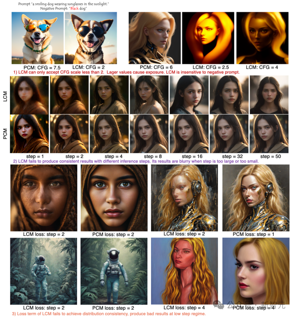 虽然AnimateLCM已经取得了很好的效果,但开发团队并没有就此止步,而是选择在此基础上进一步探索。在5月发表的最新论文中,作者指出,潜在一致性模型依旧存在一些本质缺陷。论文逐个调查了这些缺陷背后的成因,并提出了改进过的阶段一致性模型(Phased Consistency Model,PCM),实现了显著的提升。论文地址:https://arxiv.org/abs/2405.184071. 可控性:在图像和视频生成中,有一个名为CFG的重要参数(classifier-free guidance),控制文本提示对生成结果的影响程度。CFG值越高,图像或视频与提示的相关程度就越高,但也提高了画面失真的可能性。Stable Diffusion模型在较大的CFG值范围内(2~15)都能生成出较好的画面,但LCM可接受的CFG值一般不能超过2,否则就会出现过度曝光问题。无法提高CFG值,大大限制了文本提示对生成视频的可控性。此外,LCM对负面提示也非常不敏感,比如下图的第一个例子中,模型会「明目张胆」地无视提示要求,偏要生成一只带黑色毛的狗。2. 一致性:这两种模型都只能使用随机的多步采样算法,因此即使采用同一个种子开始生成,在推理过程中也能看到各步骤之间明显的不一致。3. 效率:除了上面两个硬伤之外,作者发现,LCM在少于4步的少步骤推理中无法给出较好的生成结果,因而限制了采样效率。实施了针对性的解决措施后,PCM在1~4步推理时生成的视频效果相比LCM有了肉眼可见的显著优化。后续的消融实验也证明了PCM这些创新设计的必要性。从MotionI2V到AnimateLCM,再到最新的PCM,鹿影团队逐步的迭代中不断寻求突破和提升,实现了PCM的惊艳效果,模型的先进性能从基准测试的得分和横向对比中就可见一斑。在单步推理生成图像时,PCM方法在2个数据集、5个指标上几乎都超过了Stable Diffusion-Turbo的得分,一致性得分的优势更加显著,从SD-Turbo的0.71提升至0.81。当推理步骤从第1步逐渐增大到第16步时,这种优势依旧明显。多数情况下,使用普通ODE求解方法的更胜一筹。使用CLIP分数、光流估计、CLIP一致性三个指标量化评估视频生成质量时,PCM模型依旧在少步骤推理(≤4步)中取得了明显的优势,相比其他两个Diffusion架的构基线模型DDIM、DPM以及AnimateLCM都有大幅度提升。值得一提的是,鹿影科技的研发并非一朝一夕之功,他们的技术创新持续数年并不断迭代。比如2022年提出的新颖架构FlowFormer在当时的Sintel光流基准测试中排名第一,2023年发布的视频光流估计框架VideoFlow在所有公共基准测试上刷新了SOTA。