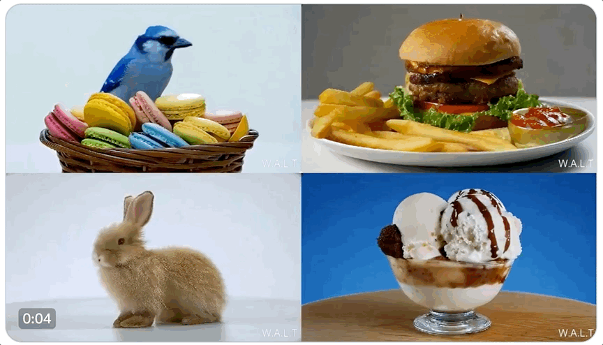 根据论文,W.A.L.T在视频生成基准UCF-101和Kinetics-600、图像生成基准ImageNet测试上实现了SOTA(当前最优效果)。