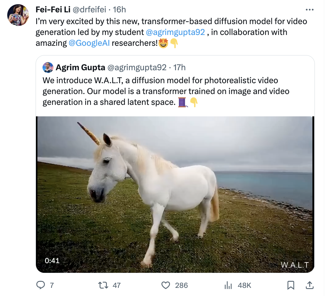智东西12月12日报道,今日,李飞飞及其学生团队与谷歌合作,推出了AI视频生成模型W.A.L.T(窗口注意力潜在Transformer ,Window Attention Latent Transformer)。