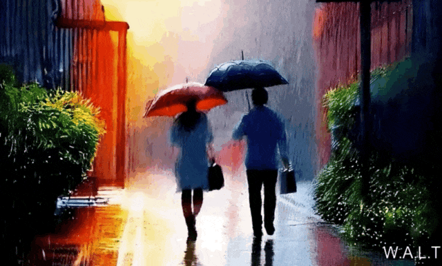 一对情侣撑着雨伞走回家,倾盆大雨,油画风格。(A couple walking home with umbrellas, heavy downpour, oil painting style.)