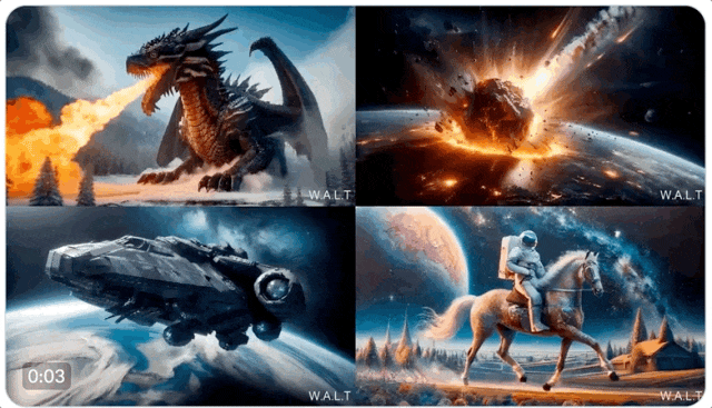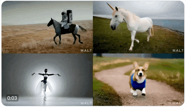 W.A.L.T模型目前支持文生视频、图片转视频和3D相机拍摄视频三项能力,团队展示了一系列W.A.L.T的生成示例。