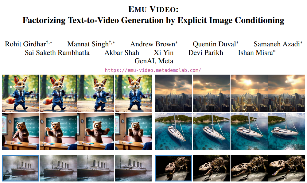 11月16日,科技巨头Meta推出了文生视频模型Emu Video。Emu Video可以通过自然语言生成高质量视频,它将视频生成分为两个步骤,首先生成以文本为条件的图像,然后生成以文本和生成的图像为条件的视频。
