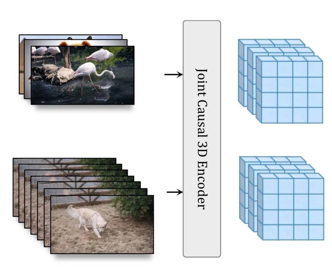 1、使用因果编码器,在一个共享潜在空间中压缩图像和视频。