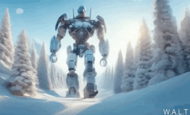一个巨大的机器人在雪里行走。(A giant robot walking through a snowy landscape.)