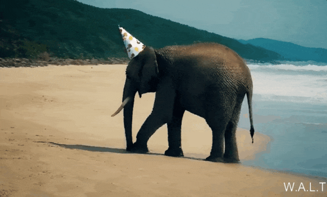一头戴着生日帽的大象在海滩上行走。(An elephant wearing a birthday hat walking on the beach.)
