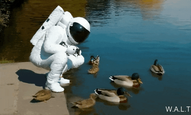 阳光明媚的下午,宇航员在喂鸭子。(An astronaut feeding ducks on a sunny afternoon.)