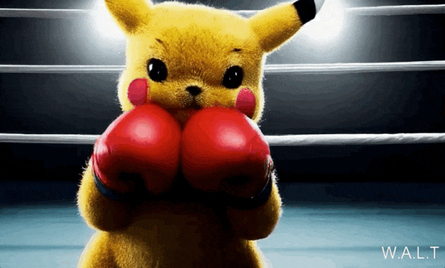 皮卡丘在拳击场内戴着拳击手套。(Pikachu wearing boxing gloves, inside a boxing ring.)