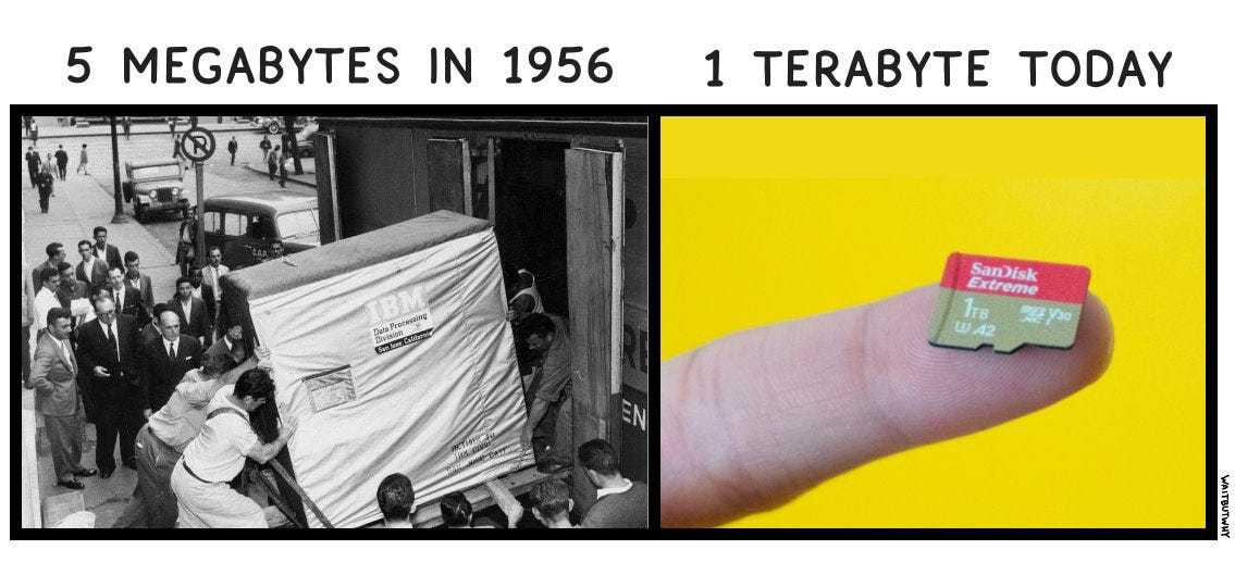 技术进步的速度十分惊人。我一直很喜欢这样子的可视化:1956 年的 5 MB与今天的 1 TB 的对比。告诉你一点背景信息,1 TB = 1000000 MB。 1956 年的 1 TB 的硬盘驱动器相当于 40 层楼的大小;今天,你的指尖就能容得下 1TB。