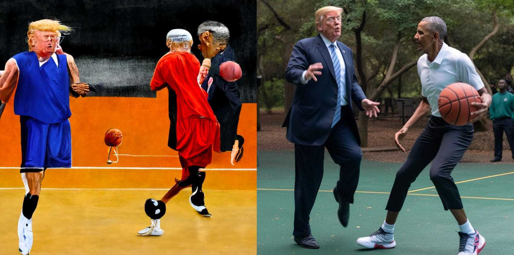 这里的要点是:事情发展得很快。进步的步伐也延续到了 AI 身上。十年前,人工智能还很难分辨猫与狗。今天,人工智能不仅可以分类,还可以根据文本提示生成猫狗的详细图像。模型正在迅速改进。下面这两张图(巴拉克·奥巴马与唐纳德·特朗普打篮球)来自我上周的文章,一样的提示,Midjourney 1 年前的输出与今天的输出的对比: