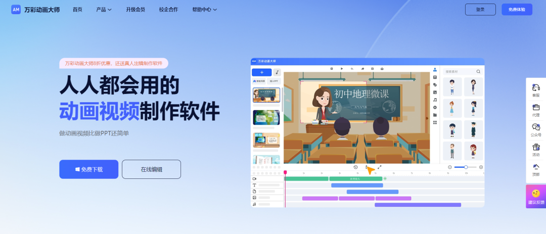 特点:万彩动画大师是一款专注于MG动画制作的软件,内置了丰富的角色、场景、道具等素材库,支持自定义角色和场景。它利用AI技术可以自动生成动画效果和配音,使得动画制作更加简单高效。