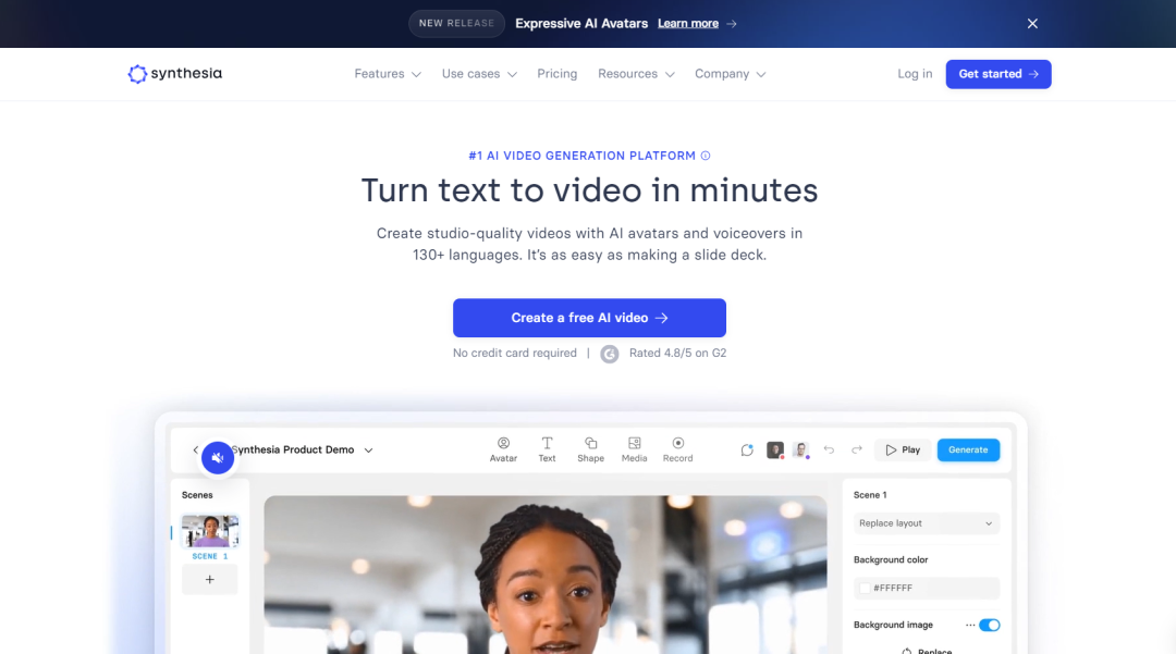 特点:Synthesia是一款基于ChatGPT的文本到视频生成器,可以帮助用户快速创建带有AI头像的视频。它支持60多种语言和各种模板、屏幕录像机、媒体库等。