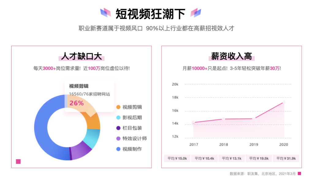 此外,在职业新赛道,短视频也属于新风口,90%以上行业都在高薪招视效人才。